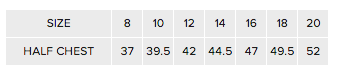 | Half Chest (cm) | 37 | 39.5 | 42 | 44.5 | 47 | 49.5 | 52 |